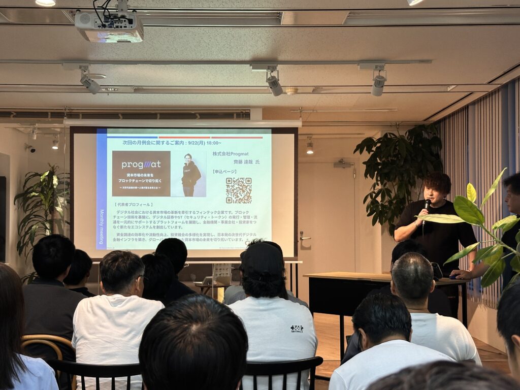 次回(9月)の月例会は、株式会社Progmatの齊藤 達哉氏を講師に迎え、ブロックチェーンと次世代金融インフラについての講演を予定しています。